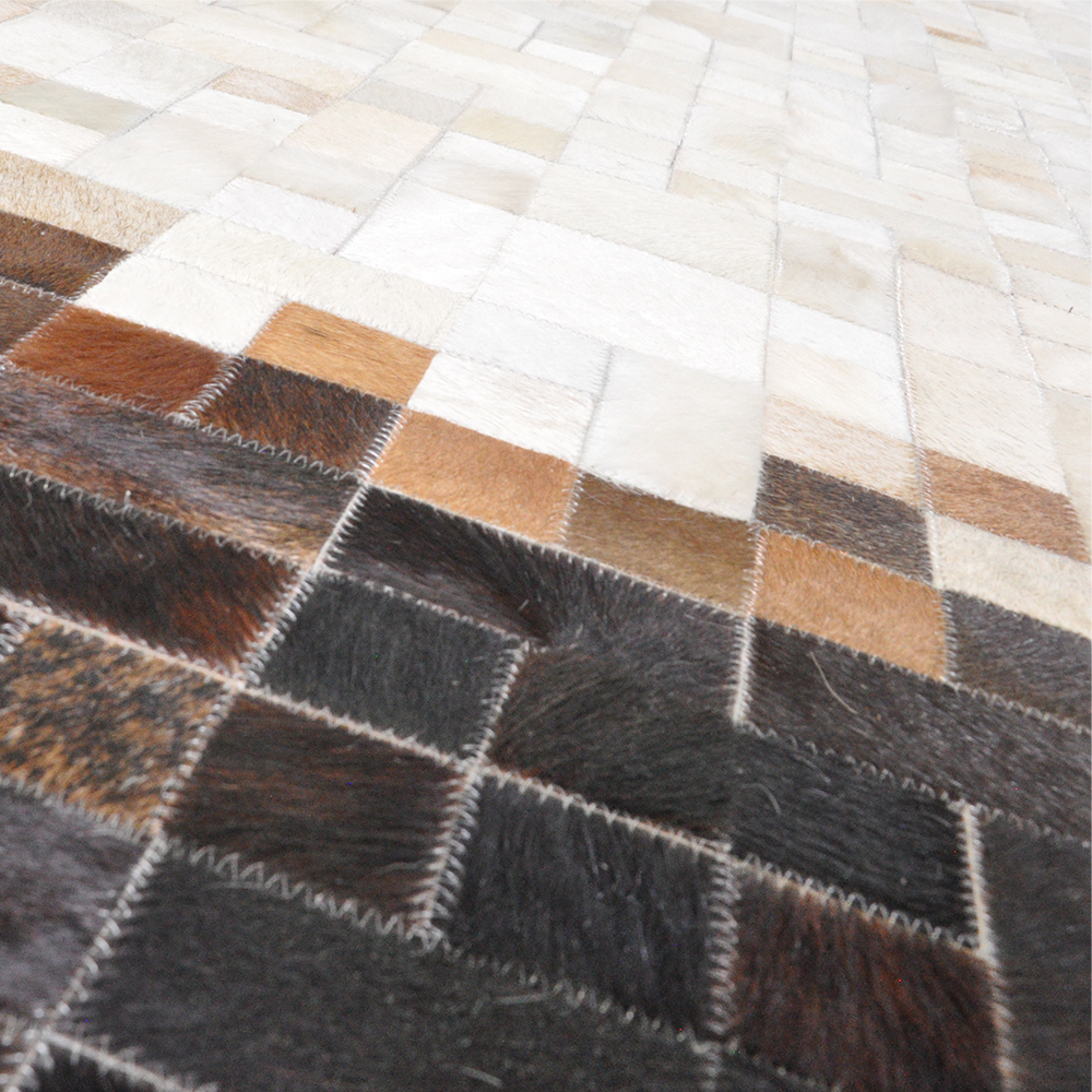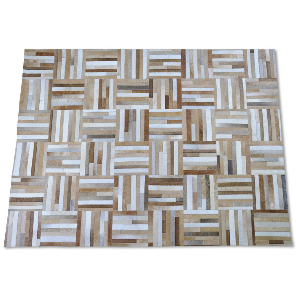 Materiales: 100% cuero, Color: Cafés, Bages, Blancos . Backing en Latex y protector de Piso. Elaborado 100% a mano.