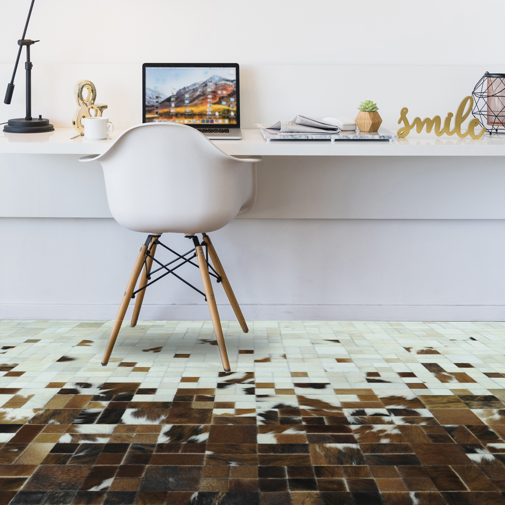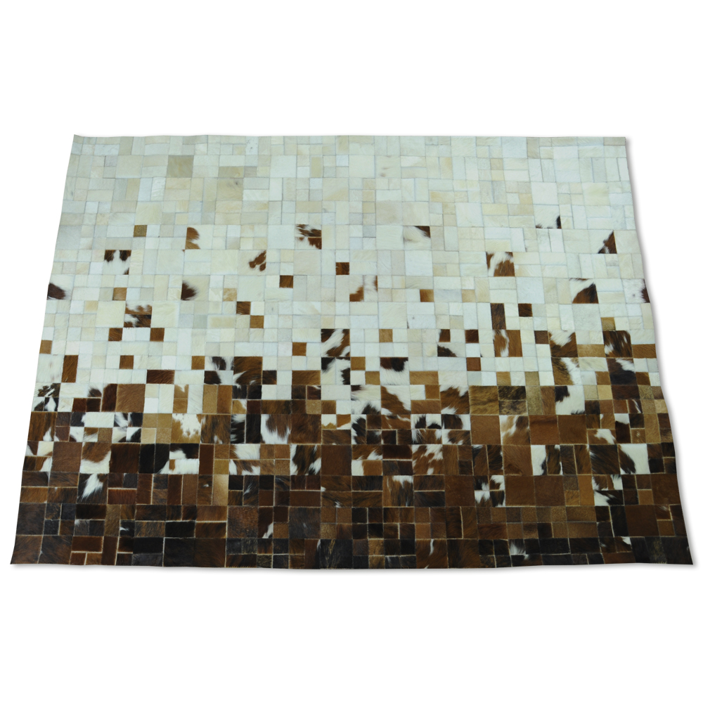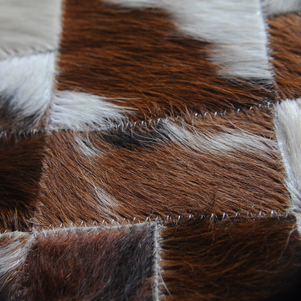 Materiales: 100% cuero, Color: Cafés, Blancos . Backing en Latex y protector de Piso. Elaborado 100% a mano.