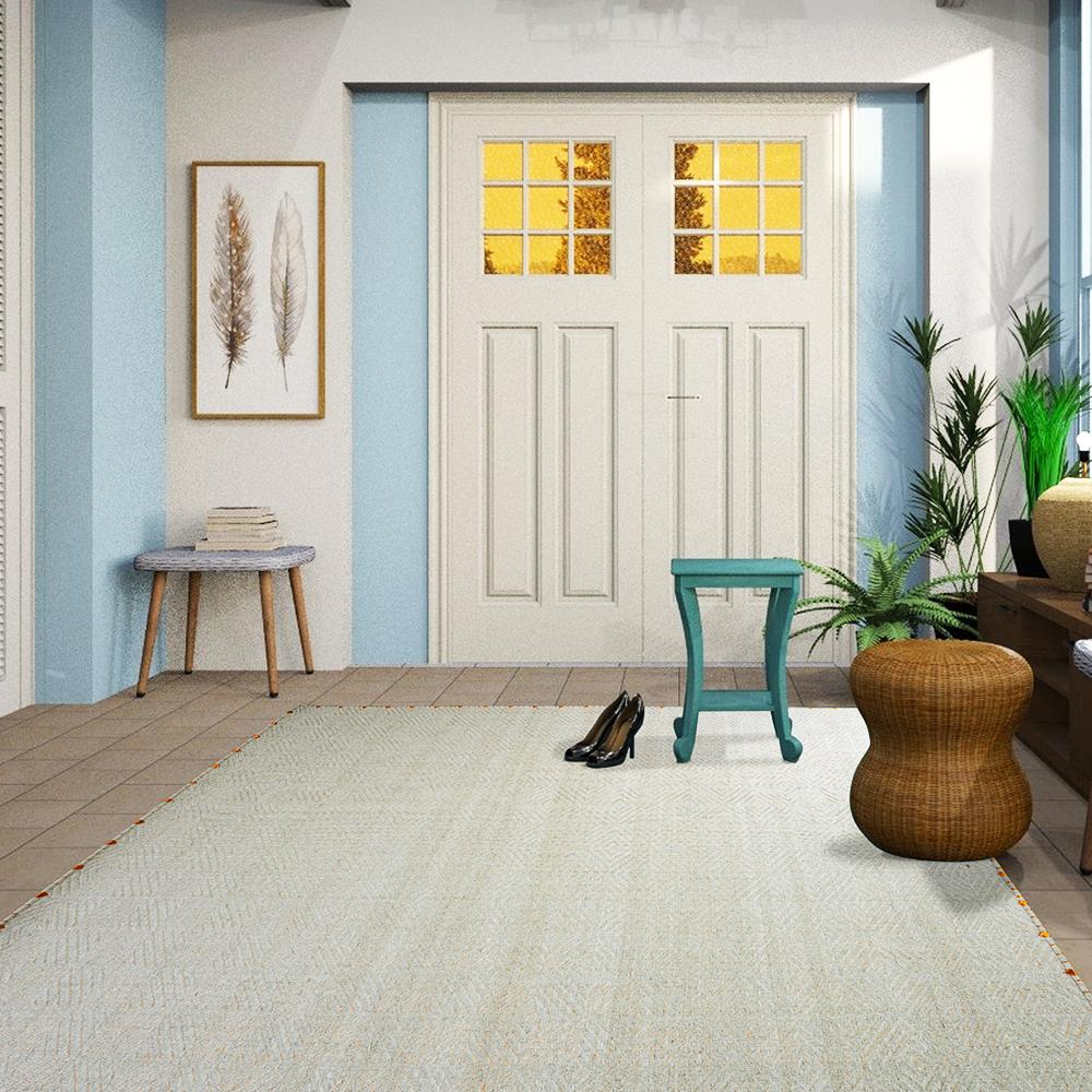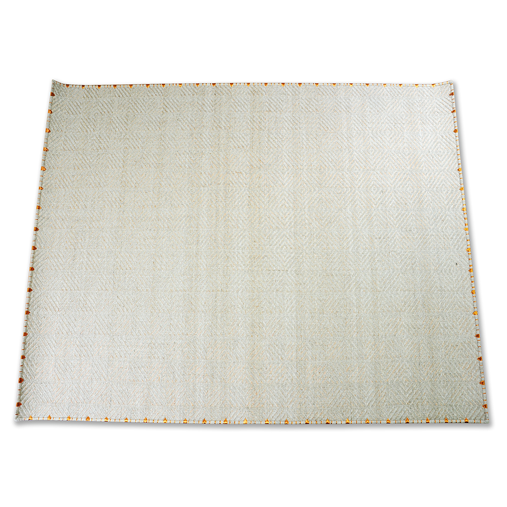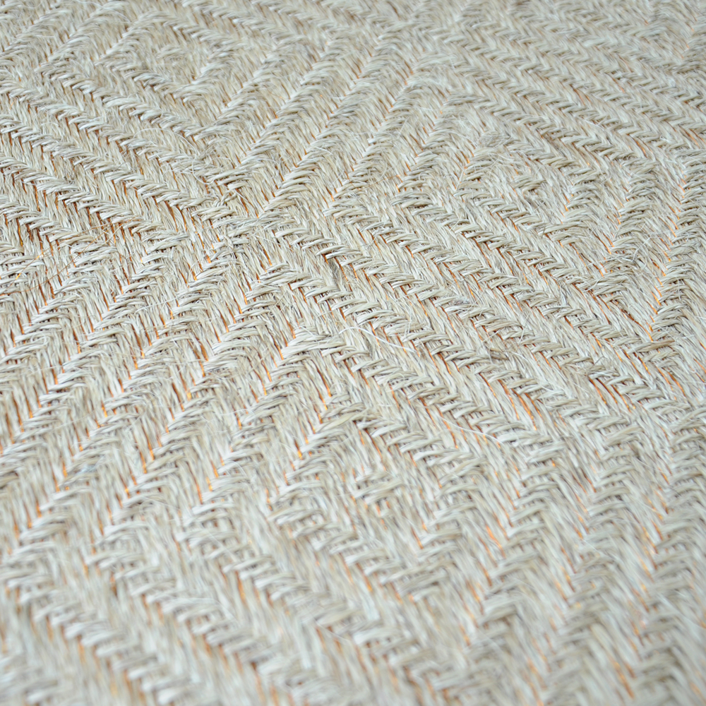 Materiales: (90%) Fique Natural – (10%) Cobre. Color: Sobremadurado. Bordado: en Fique y Cobre. Backing en Latex y protector de Piso. Tejido 100% artesanalmente en telar horizontal.
